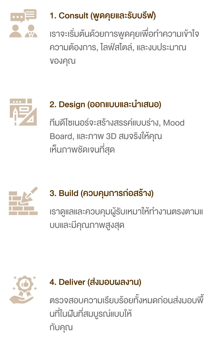 เราให้บริการตกแต่งภายในแบบครบวงจรสำหรับบ้านระดับพรีเมียม โดยงบประมาณเริ่มต้น